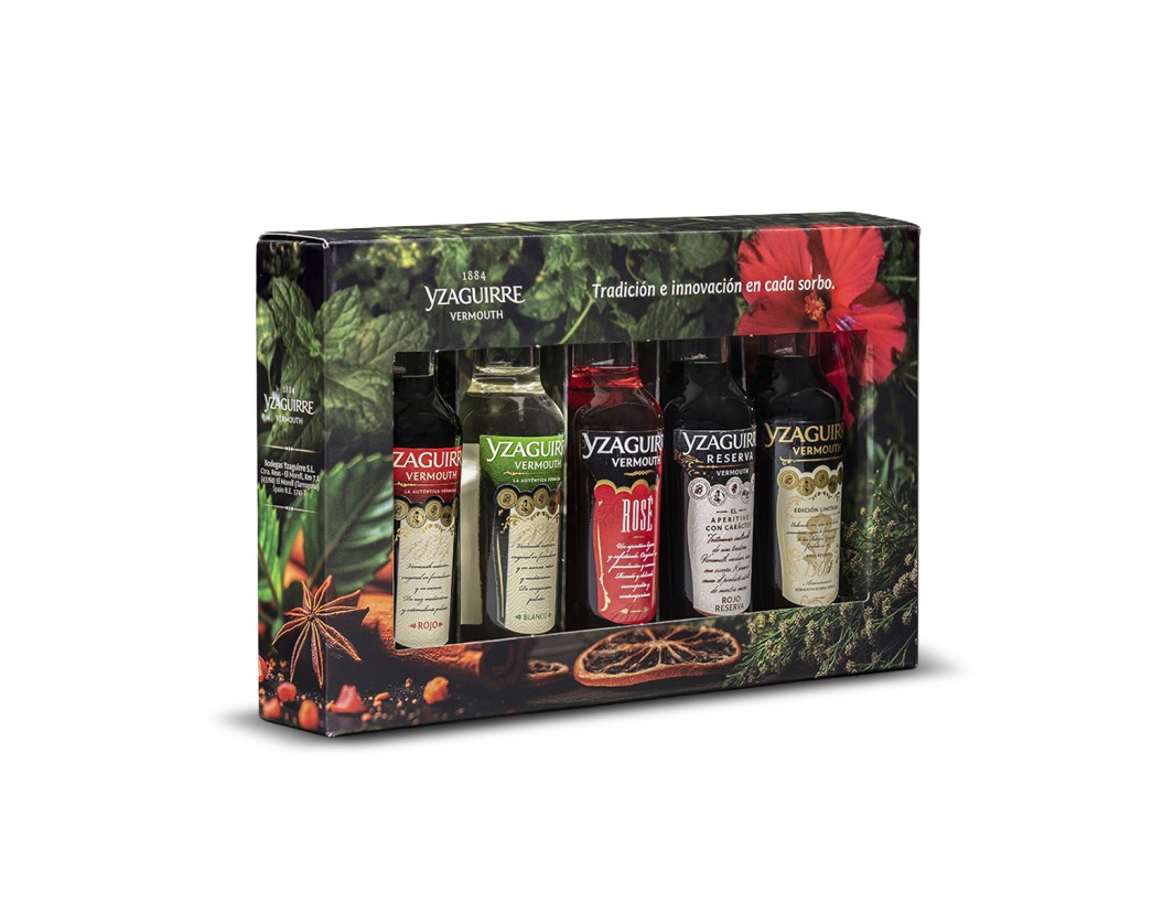 El estuche incluye 5 botellas de 100 ml para vermutear de distintas formas. El Vermouth Yzaguirre Rojo Clásico, equilibrado y aromático, es el aliado ideal para un aperitivo espontáneo. El Vermouth Yzaguirre Blanco Clásico sorprende con sus notas suaves de vainilla, canela y limón, aportando un perfil fresco y delicado. Para los más intrépidos, el más goloso, el Vermouth Yzaguirre Rosé, que destaca por su atractivo color y sus toques cítricos.